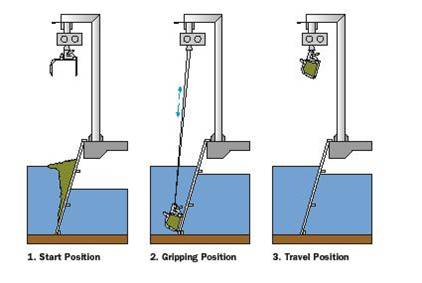 ◎抓爪单元由一系列齿条组成,它们可以通过液压顶杆开启或闭合。液压油管将动力从移动小车上的液压站传送至液压顶杆,油管缠绕在一张紧的鼓上,和耙斗提升装置同步运转。耙斗通过装有弹簧的摆动限位板在移动时可保持平稳。